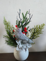A striking silver cardinal perched atop a pine branch, surrounded by red berries and sparkling poinsettia flowers, creates a beautiful arrangement in a faux birch planter. This design captures the essence of the season within an elegant round ceramic vase. It makes for a wonderful seasonal accent that is sure to bring a smile to the faces of family and friends, adding warmth and cheer to any holiday setting.