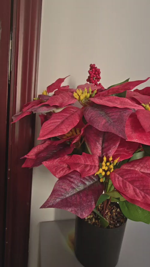 Features 10 large 8” velvet poinsettias—soft to the touch—plus 2 clusters of tall holly berries and real-touch Christmas greenery. Looks just like fresh flora, no wilting or maintenance needed. Comes in a 4.5"×4.5"×4.5" plastic pot.