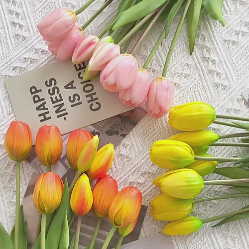 - Our tulips are crafted with a new material, soft latex. This material can prevent the flowers from color change and fading. When you sprinkle water on the flowers, the new material allows water droplets to remain on the flowers for an extended period, making them look incredibly realistic and charming.
