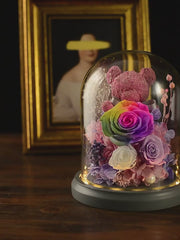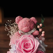 The charming moss bear adds a whimsical and romantic touch to the preserved roses. This unique combination creates a heartwarming display that captures both elegance and cuteness.