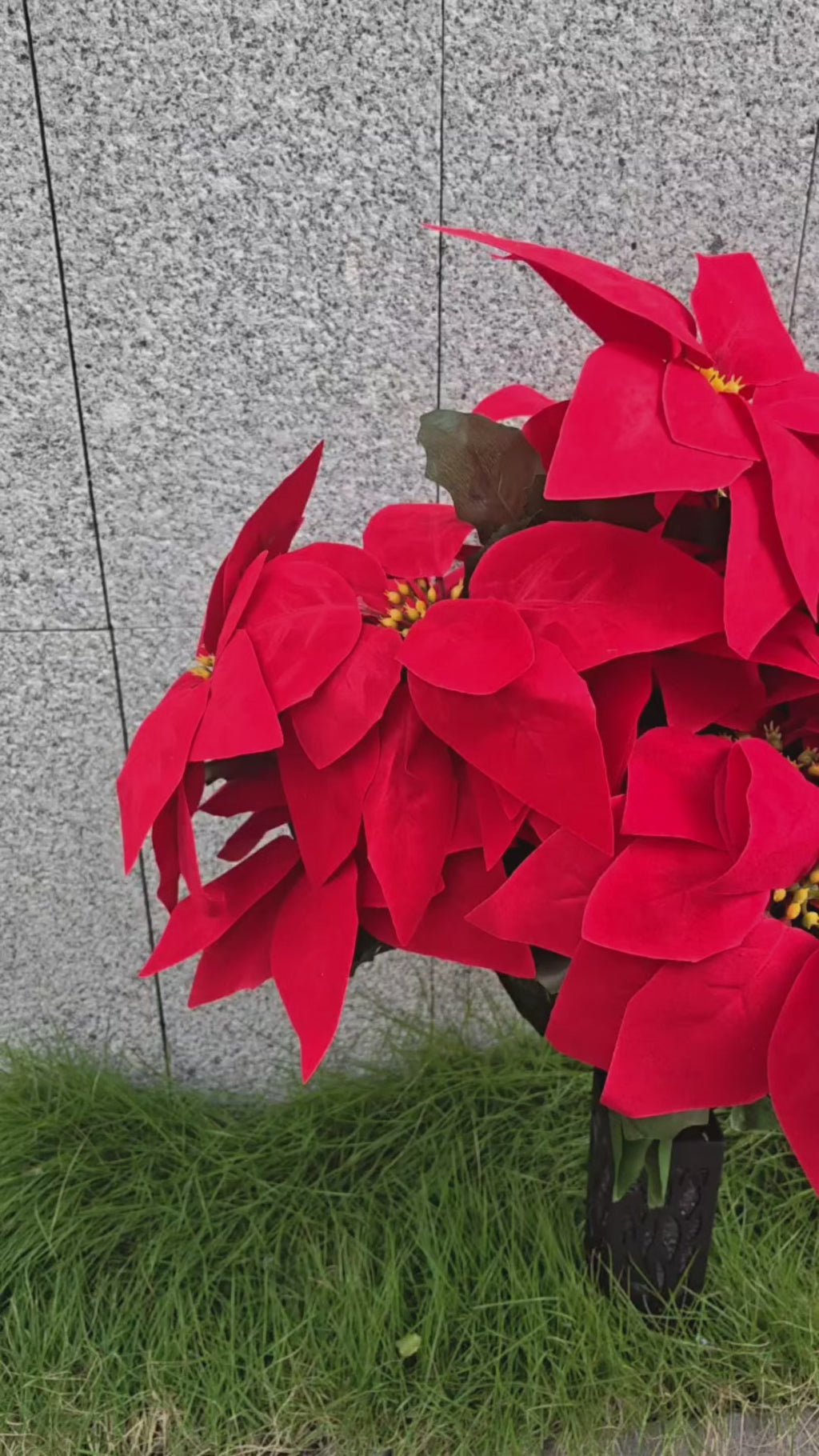 Standing 24 inches tall and 18 inches wide, these Christmas cemetery flowers feature 24 large 8.6" red velvet poinsettias in a 360-degree display. Every angle shows lush, layered blooms—bringing all-around beauty and holiday warmth to honor your loved one.