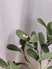Features a classic mistletoe design with pale green leaves and bright white berries and has a red satin bow at the bottom.