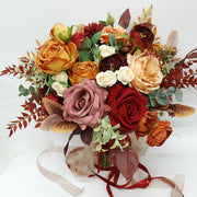 A captivating floral arrangement featuring dusty rose, deep red rose, champagne rose, orange rose, ivory rose buds, red chrysanthemum, and artificial plants and leaves.
