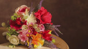 Diverse Floral Combination: Carefully arranged with yellow hibiscus, red hibiscus, fuchsia hibiscus, lavender, pink daisy, gradient pink rose, pink dahlia, white daisy, white rose, and green leaves, creating a rich, harmonious color palette and a romantic, dreamy wedding atmosphere.