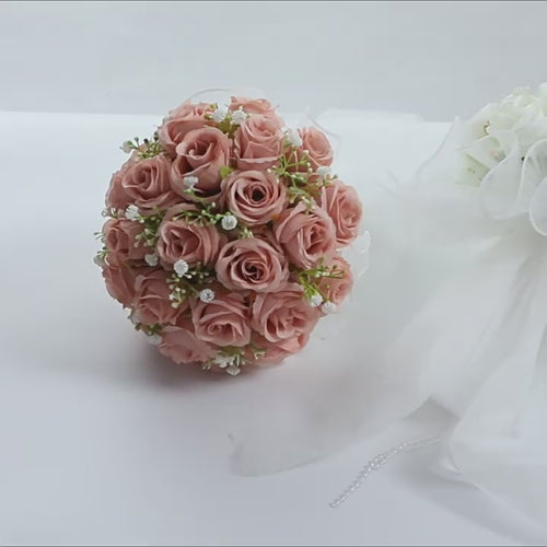 The round shape of the bouquet offers a timeless and sophisticated look, making it a popular choice for brides of all styles. Composed primarily of exquisite roses, the bouquet showcases their beauty and fragrance, adding a romantic touch to the bridal ensemble. Perfect for both traditional and modern weddings, the round shape complements various dress styles and bridal aesthetics.