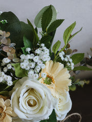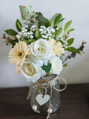 Composition florale avec vase comprenant des roses blanches, des gerberas champagne, du gypsophile et des plantes artificielles ainsi qu'un vase à herbe assorti. Le vase en verre avec pendentifs en forme de cœur et sphériques et corde de chanvre. Veuillez y mettre un bouquet de fleurs artificielles lorsque vous recevez le produit. Fleurs artificielles avec vase adaptées aux centres de table pour la salle à manger, la décoration de la table basse, la décoration de la ferme, la décoration de la salle de bain, les décorations de table pour le salon.