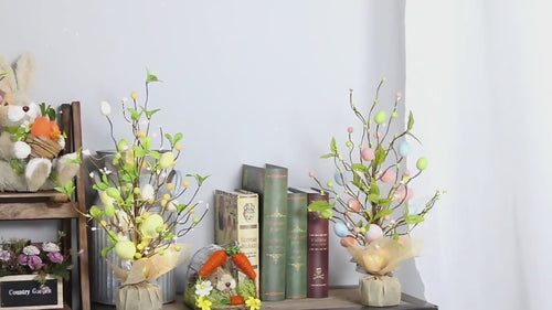 - 【Matériel】:Cet arbre à œufs de Pâques est composé d'une petite guirlande lumineuse à LED, d'une base en ciment, d'œufs artificiels, de fleurs et de feuilles vertes